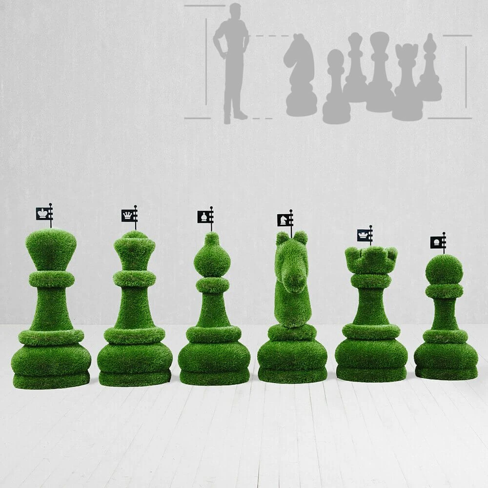 Alle Figuren entstehen als 3D-Modell am Computer. Anschließend wird der Rahmen aus Glasfaserkunststoff hergestellt und von Hand mit Kunstrasen beklebt. Jede Skulptur ist somit ein individuelles Unikat. Dank des Glasfaser Rahmens sind die Topiaries besonders leicht, stoßfest und langlebig – außerdem rostfrei, korrosions- sowie temperatur- und UV-beständig. Es sind keine weiteren Pflegemaßnahmen nötig. Die Gewichtsbeschränkung für die Formschnittfiguren liegt zwischen 30 bis 250kg. Wichtig ist, dass die Skulpturen weit entfernt von Feuerstellen aufgestellt werden.