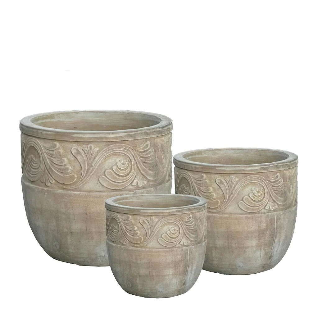 Das 3er Pflanzkübel Set SADE, bestehend aus drei Pflanztöpfen mit den Maßen 21x21cm, 27x28cm und 33x36cm (HxDm), wird aus Terrakotta handgefertigt und besticht neben der bräunlichen Antik Optik vor allem mit einer tollen floralen Verzierung. Diese runden, stilvollen Outdoor Pflanzgefäße werden ein Blickfang in Ihrem Garten oder auf Ihrer Terrasse.