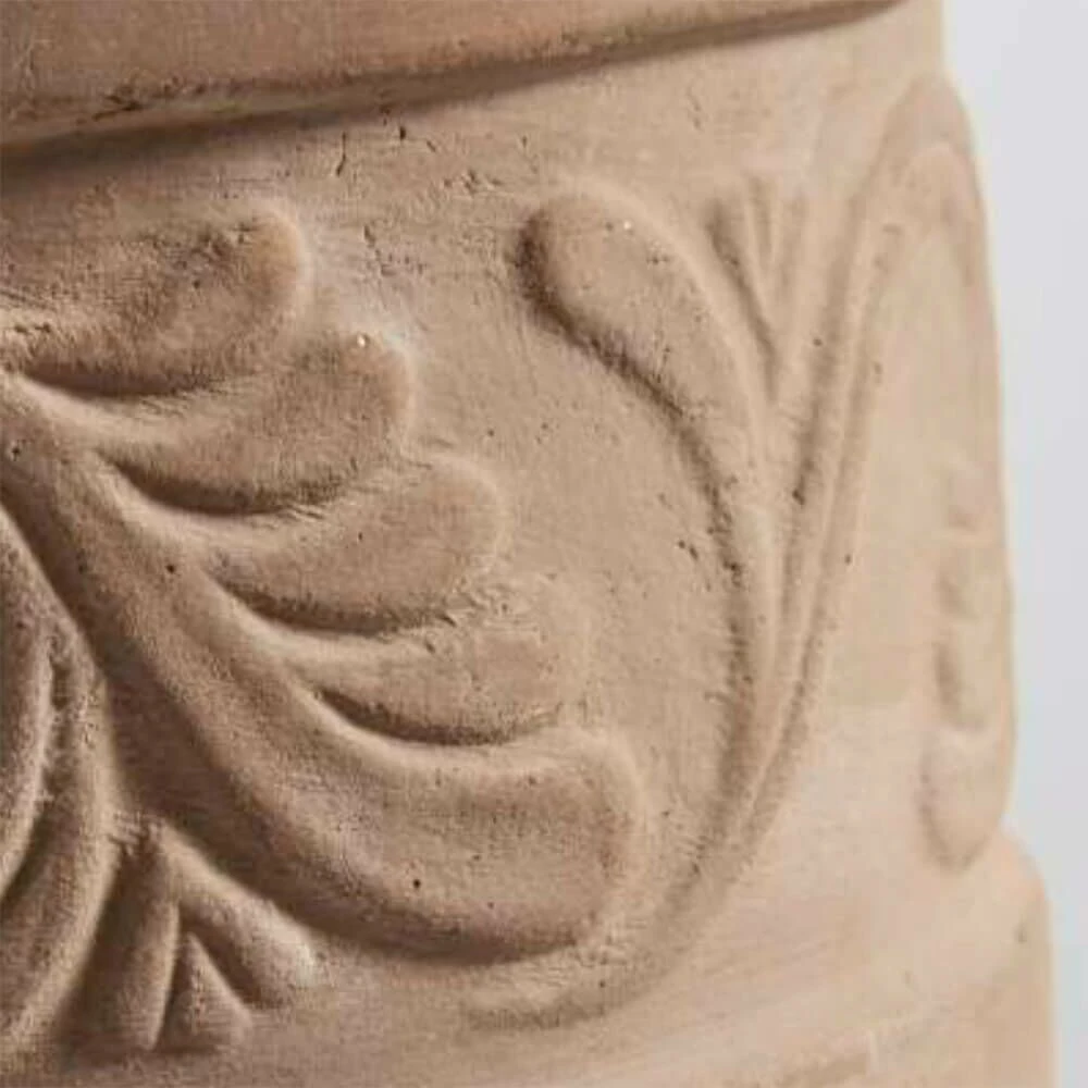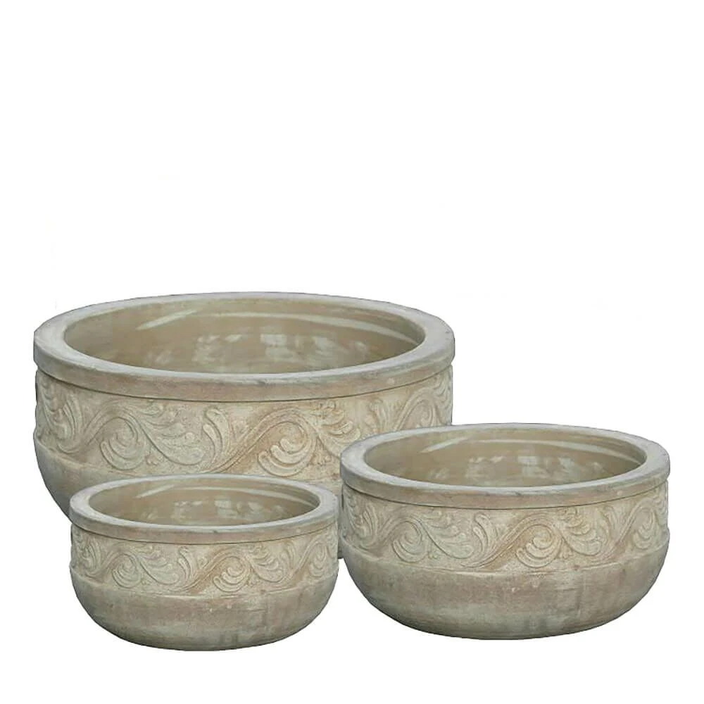 Das 3er Pflanzschalen Set ONNA, bestehend aus drei Schalen mit den Maßen 11x21cm, 15x28cm und 18x36cm (HxDm), wird aus Terrakotta handgefertigt und besticht neben der bräunlichen Antik Optik vor allem mit einer tollen floralen Verzierung. Diese runden, stilvollen Outdoor Pflanzgefäße werden ein Blickfang in Ihrem Garten oder auf Ihrer Terrasse.