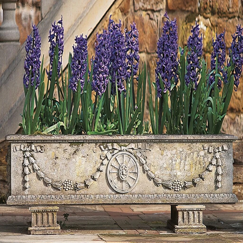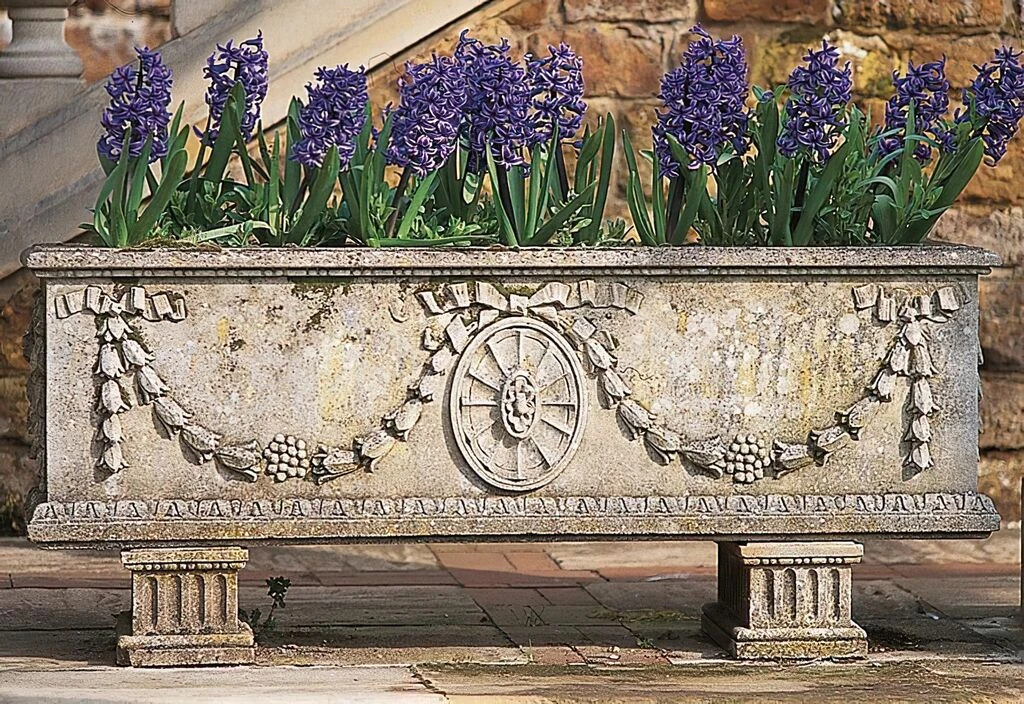 So gelingt die kunstvolle Gartengestaltung leicht – mit diesem XXL Blumentrog im antiken Design erhalten Sie Gartengefäß von einzigartigem Design und eleganter Schönheit. Mit diesem originellen Pflanztrog setzen Sie Ihre Pflanzen optimal in Szene: Der Pflanztopf ist aus echtem englischem Steinguß gefertigt und verziert mit vielen schönen Details. Die rechteckige Steinamphore ist designt im Adam-Stil, einem populären Stil des 18 Jahrhundert, welcher sich sehr an antiken Gestaltungsmerkmalen orientiert. Der Blumenkasten ist reichlich geschmückt mit Girlanden und Medaillons, durch seine beachtliche Größe ist er ein echter Hingucker für jeden Garten. Der XXL-Pflanztopf kann freistehend verwendet werden, außerdem sind passende Standfüße erhältlich.