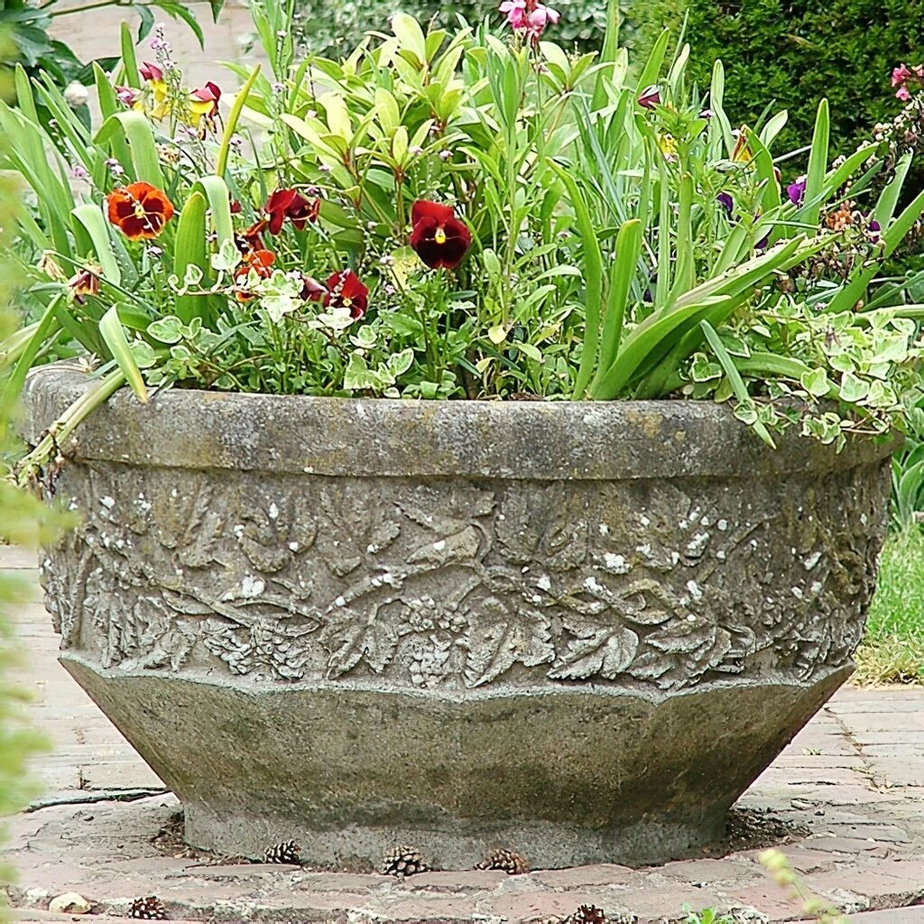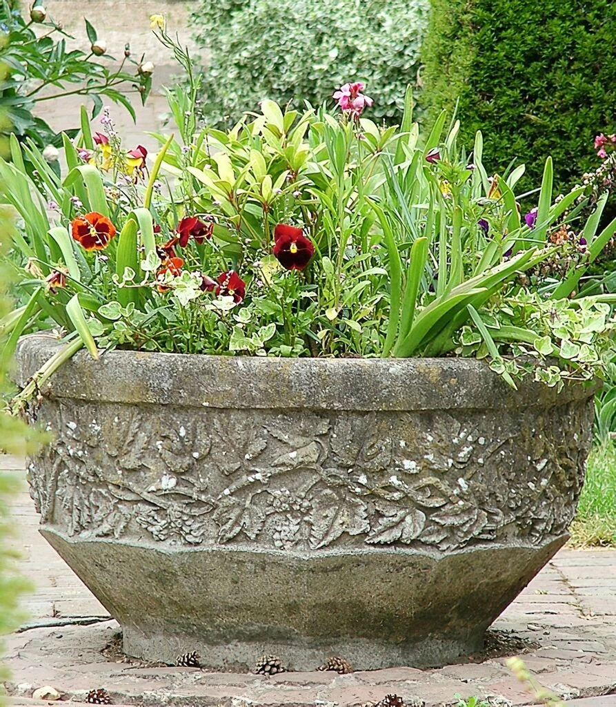 Massiv und stilvoll zeigt sich dieser XXL Pflanzkübel aus Stein in einem antiken Design. Die eckige Optik der Standfläche wird durch eine runde Form mit kunstvollen Verzierungen nach oben abgelöst. Ragons Manor besticht durch Ausdrucksstärke und Einzigartigkeit. Eine enorme Größe setzt auch ausladend wachsende Pflanzen stilgerecht in Szene. Blätter und Ranken umsäumen den Blumentopf und verleihen ein natürliches, frisches Aussehen. Diese eindrucksvolle Gartenamphore eignet sich hervorragend, um verschiedene Gewächse zu kombinieren. Auf Grünflächen oder im Beet stehend besticht das Steingefäß durch eine individuelle Optik und ist auch an Gehwegen oder auf Kiesuntergründen ein optimaler Blickfang.