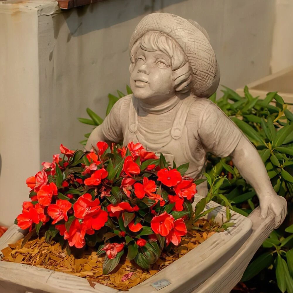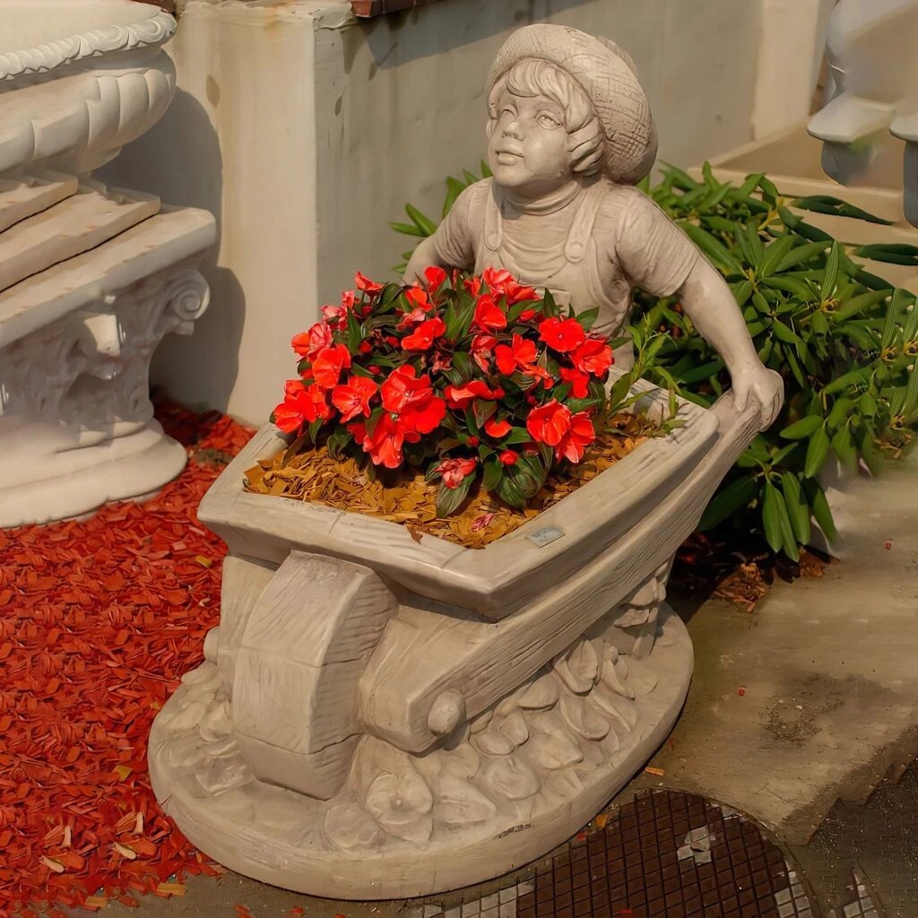 Bepflanzbare Dekoskulptur Aus Steinguss – Junge Mit Schubkarre – Evoida
