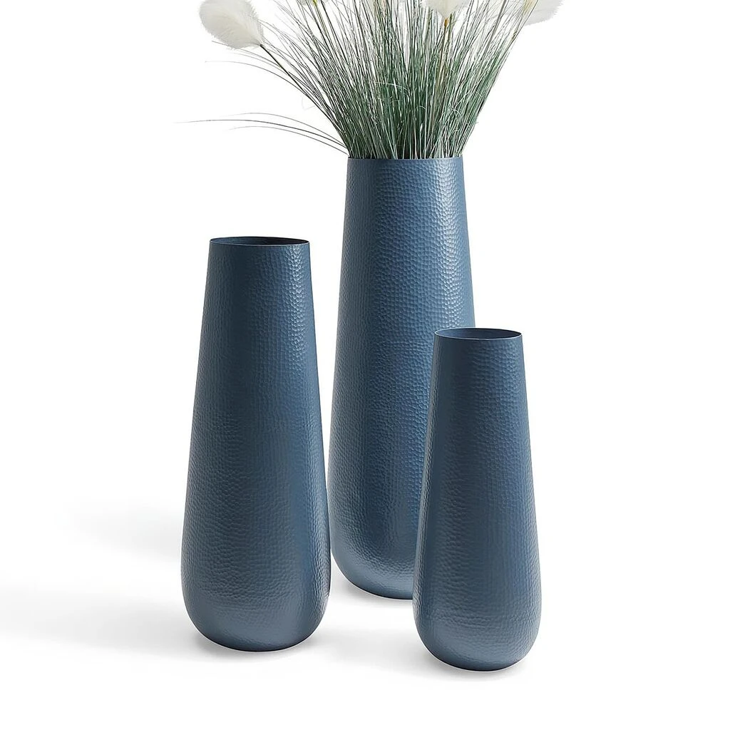Die blauen Outdoor-Vasen werden aus Aluminium mit einer besonderen Oberfläche im handwerklichen Hammerschlag-Design gefertigt.