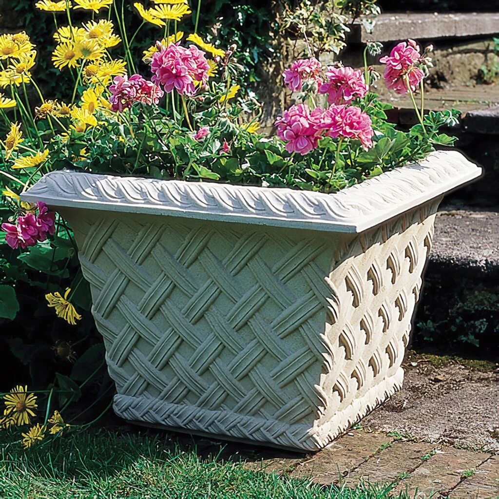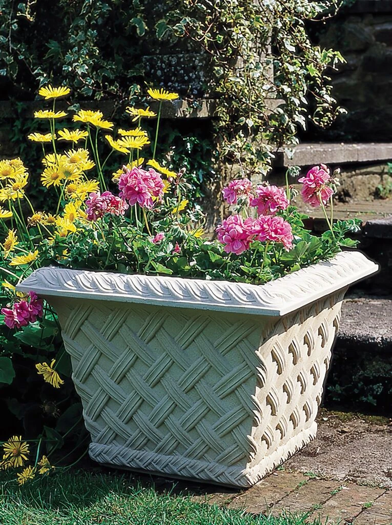 Wir bieten hier ein elegantes Pflanzgefäß aus echtem englischem Steinguss, rechteckig, mit einem edlen Flechtkorb-Design. Das Material, ein Kunststein, eignet sich hervorragend für die ganzjährige Gartendekoration, die Amphore ist absolut frostsicher und witterungsbeständig. Der edle Blumentopf kann einfach bepflanzt werden, womit sich tolle Effekte bei der Gartengestaltung erzielen lassen. Aber auch einzeln stehend ist dieses Gartengefäß im elisabethanischen Stil ein wertvolles Schmuckstück. Ein tolles Accessoire für alle Fans der beliebten englischen Gartenkunst.