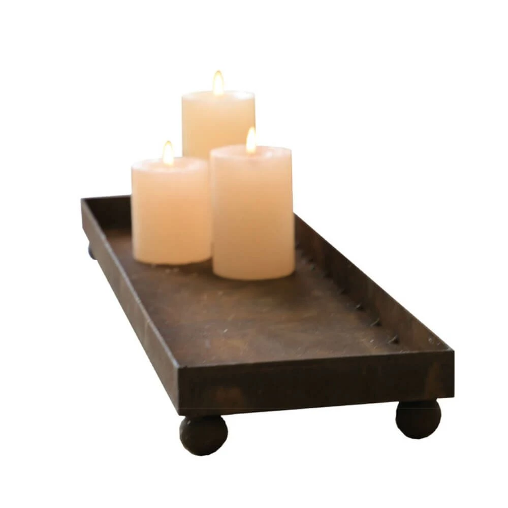 Dieses Deko Tablett wird aus rostigem Metall hergestellt und ist für den dauerhaften Verbleib im Freien geeignet. Die Kerzen sind nicht im Lieferumfang enthalten.