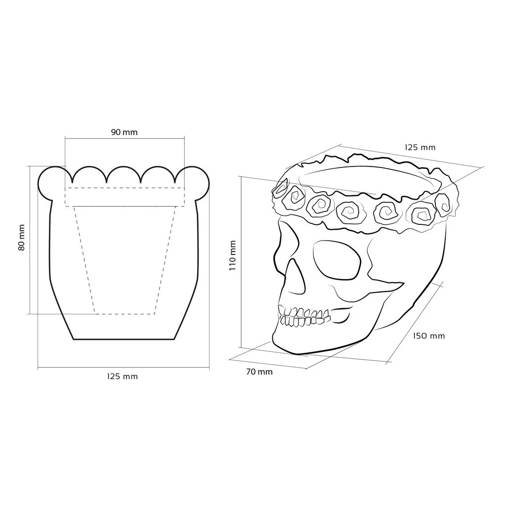 Mit einem Rosenkranz ist dieser Blumentopf als Totenschädel geformt und extrem robust gegenüber Witterung. Das Pflanzgefäß ist optimal für den Einsatz im Garten geeignet.