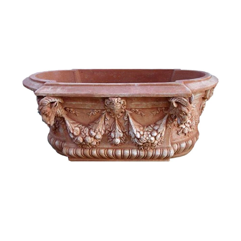 Nach antiken Vorbildern im traditionellen Brennverfahren modelliert, besticht das Pflanzgefäß durch eine außergewöhnliche Optik. Mit einem Ablaufloch versehen und witterungsbeständig ist der Terrakotta Pflanztopf optimal zur Gartengestaltung geeignet. Der Blumentrog kann mit unsweren Skulpturen stilvoll in Szene gesetzt werden.