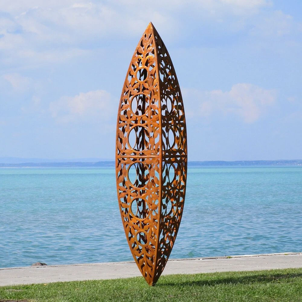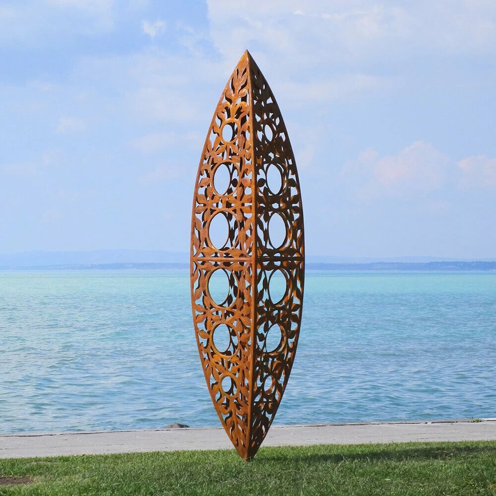 Bei den außergewöhnlichen Skulpturen unseres ungarischen Künstlers handelt es sich um handwerklich hergestellte Unikate. Die Bearbeitung erfolgt wahlweise aus nicht rostendem Edelstahl oder aber aus Stahl (St37). Letzterer ist mit einer Säure behandelt und erhält so die attraktive Rost-Patina. Diese rostigen Skulpturen sind mit einer Schutzschicht versehen, um die Lebensdauer (ca. 50 Jahre) zu erhöhen. Nach 50 Jahren können die Gartenskulpturen restauriert werden. Die Figuren sind wetter- sowie sturmfest. Der verwendete Stahl hat eine Materialstärke von ca. 0,5-1mm. Die Konstruktion wird mittels Rundeisen und Rohren innen stabilisiert. Befestigungsvorrichtungen für die Bodenmontage sind in Form von Schrauben oder Ösen bauseits berücksichtigt, sodass eine einfache Montage der Skulpturen im Garten erfolgen kann.