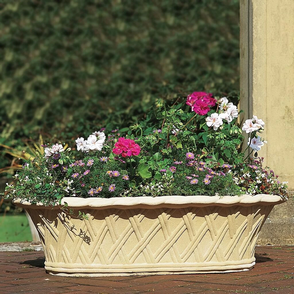 Dieser edle Pflanztrog aus echtem englischem Steinguss bietet zahlreiche Gestaltungsmöglichkeiten und sorgt für ein stilvolles Ambiente im Garten oder auf der Terrasse. Der ovale Blumentopf eignet sich bestens für die Dekoration im Außenbereich und kommt auf Mauern oder Treppen genauso gut zur Geltung wie auf einer Veranda. Das stilvolle Flechtmuster und die edlen Verzierungen geben dem Pflanztopf einen antiken Look. Der historische Pflanztrog ist aus einem winterfesten Steinguss angefertigt und sehr hochwertig. Unser Tipp: Nutzen Sie solch exklusive Blumentröge, um einzelne Bereiche im Garten oder auf dem Grundstück thematisch abzutrennen.