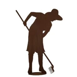 Die lebensgroße Figur einer Gärtnerin wird aus rostigem Metall hergestellt und ist für die dauerhafte Aufstellung im Außenbereich geeignet. Dank der im Set enthaltenen Platte kann die Frau mit Harke problemlos auf einer ebenen Fläche aufgestellt werden.