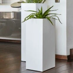 Eckige Outdoor Pflanzvase aus Polystone in hochglänzendem Weiß. Das Pflanzgefäß ist für drinnen und draußen geeignet und wird mit einem praktischen Kunststoffeinsatz geliefert. Hergestellt aus Polystone sind die Pflanzgefäße witterungsbeständig und langlebig.