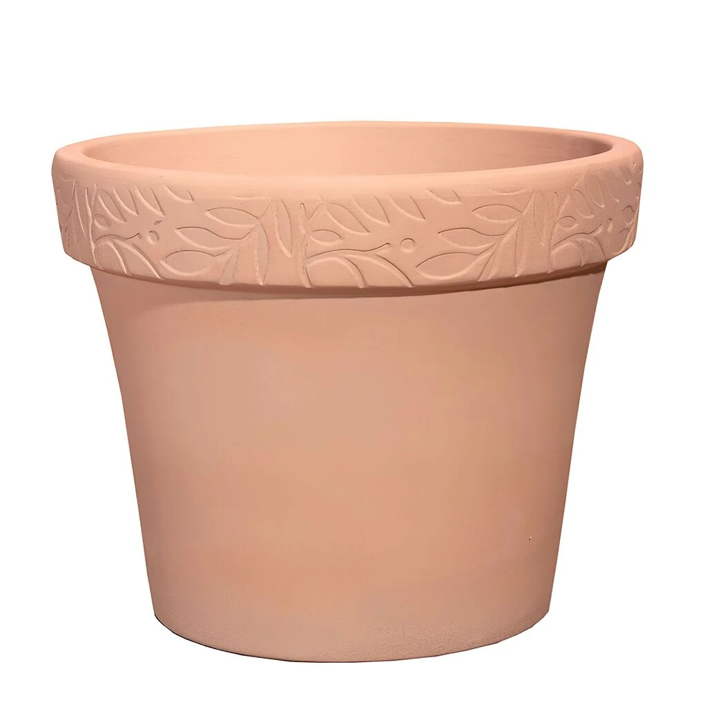 Runder Garten Blumentopf Aus Keramik Mit Schöner Olivenblatt-Verzierung – Winterfest – Terrakotta – Olea Terra Hell