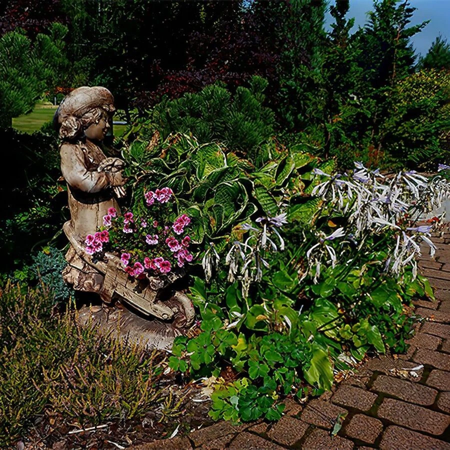 Das liebevoll gestaltete Steinguss Mädchen schiebt eine bepflanzbare Schubkarre vor sich her. Die Pflanzskulptur ist in verschiedenen Farben lieferbar und ein Blickpunkt im Beet, vor der Haustür oder auch im Park.