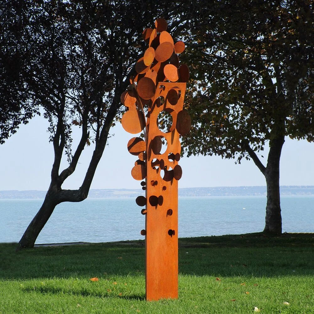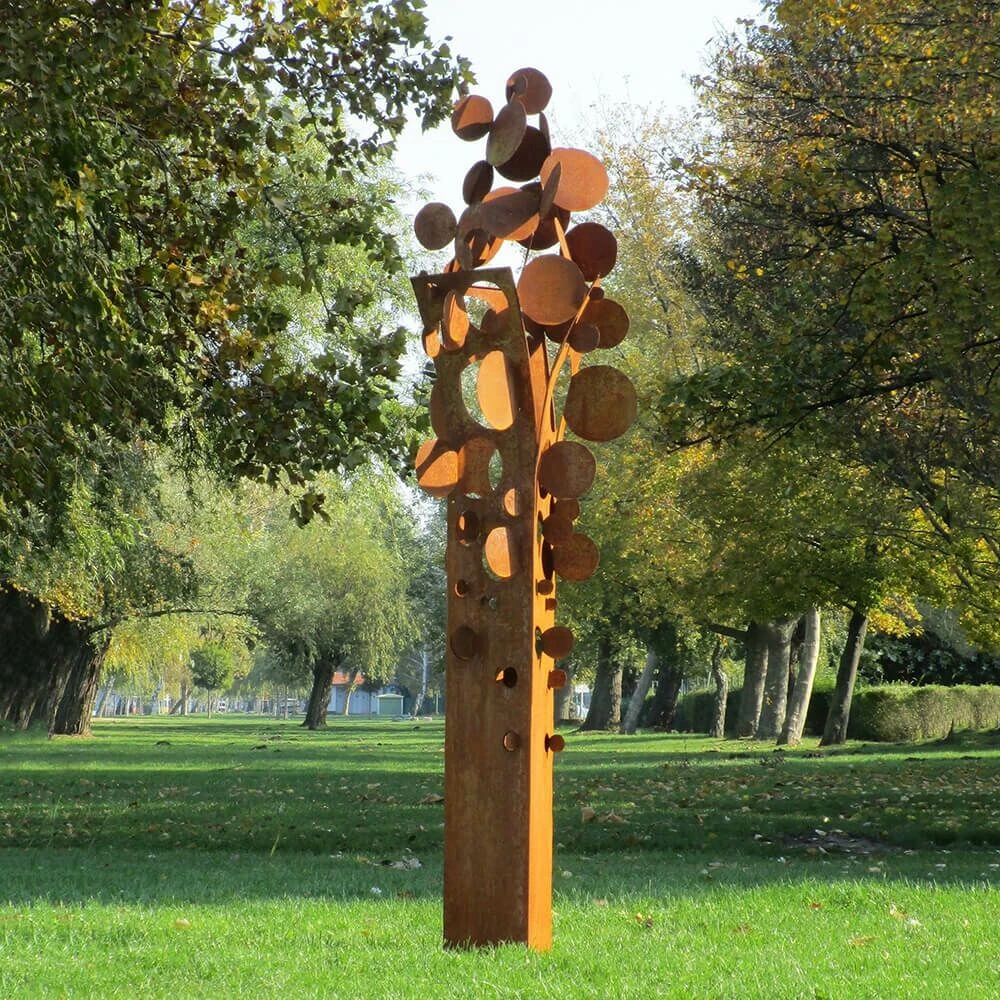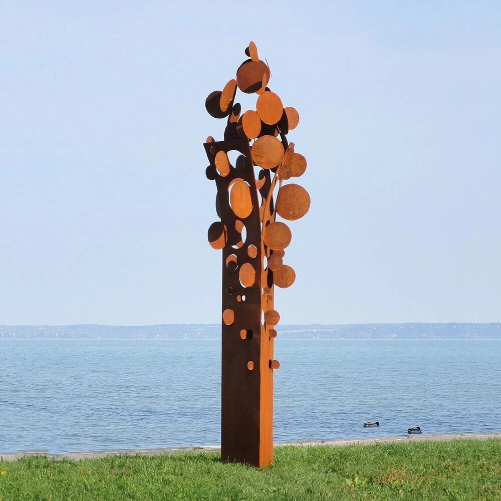 Bei den außergewöhnlichen Skulpturen unseres ungarischen Künstlers handelt es sich um handwerklich hergestellte Unikate. Die Bearbeitung erfolgt wahlweise aus nicht rostendem Edelstahl oder aber aus Stahl (St37). Letzterer ist mit einer Säure behandelt und erhält so die attraktive Rost-Patina. Diese rostigen Skulpturen sind mit einer Schutzschicht versehen, um die Lebensdauer (ca. 50 Jahre) zu erhöhen. Nach 50 Jahren können die Gartenskulpturen restauriert werden. Die Figuren sind wetter- sowie sturmfest. Der verwendete Stahl hat eine Materialstärke von ca. 0,5-1mm. Die Konstruktion wird mittels Rundeisen und Rohren innen stabilisiert. Befestigungsvorrichtungen für die Bodenmontage sind in Form von Schrauben oder Ösen bauseits berücksichtigt, sodass eine einfache Montage der Skulpturen im Garten erfolgen kann.