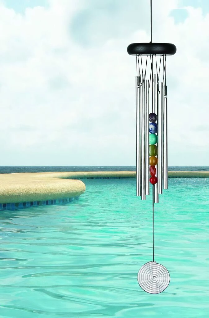 Durch die Kombination von Farbe und Klang wird bei diesem Windspiel die alte traditionelle Lehre über die Hauptenergiezentren des menschlichen Körpers aufgegriffen. Mit seinen verschiedenen Steinen symbolisiert das Klangspiel jedes der 7 Hauptenergiezentren entlang der Wirbelsäule. Edelsteinen werden oft auch magische Kräfte zugesprochen, so soll Türkis zum Beispiel das Böse abwenden und zuverlässige Beziehungen sichern.